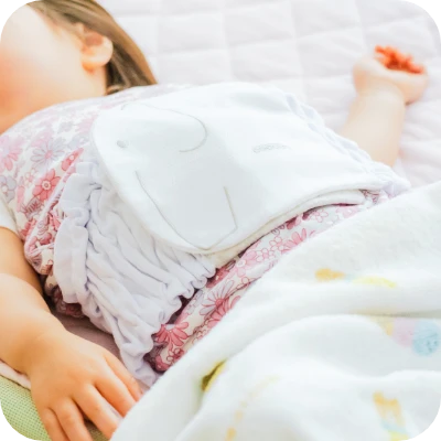 乳幼児突然死症候群のリスク要因のひとつであるうつぶせ寝を検知できる腹巻タイプのおひるねバンドの装着で、より精度の高い午睡チェックをし安全と安心をサポートしています。