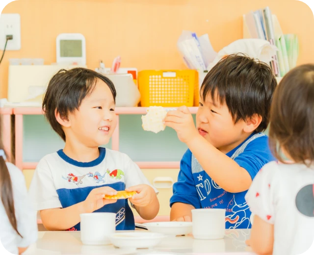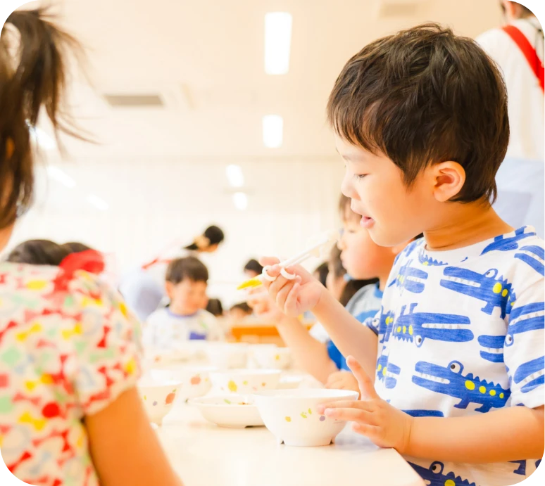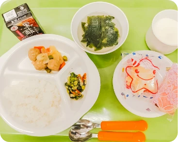 委託給食会社の栄養士がヤクルトキッズスクールならではの、ヤクルト商品を取り入れた献立を考案してくださっています。子どもたちの健康と栄養バランスを考えて、工夫をこらして用意していただきました。