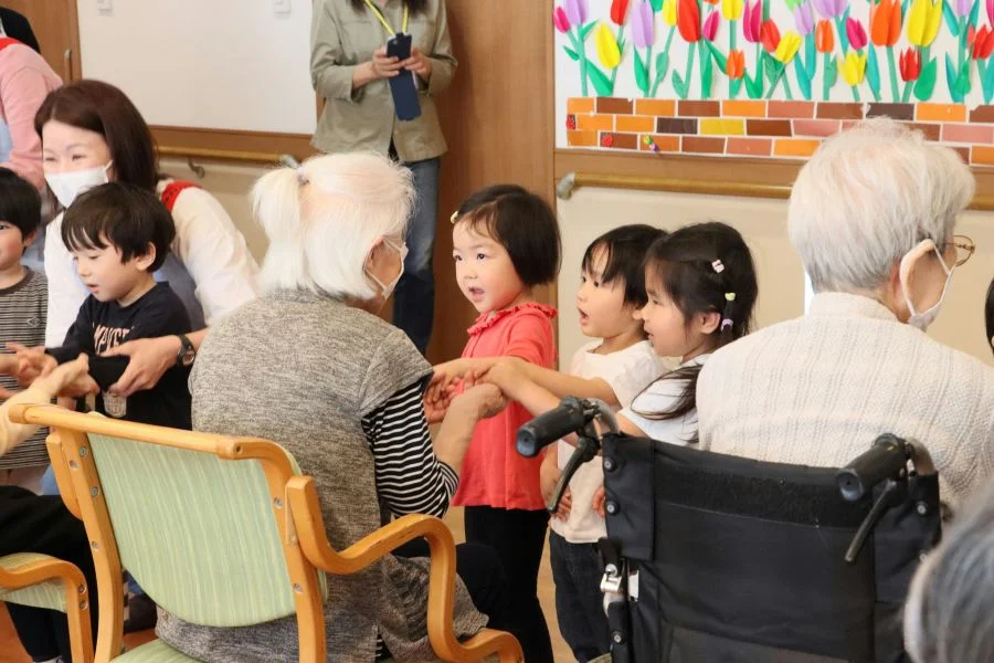 そして、「あくしゅでこんにちは」では、歌いながらおばあちゃんたちと握手をして回り、あたたかいふれあいの時間に♪歌い終わると、「上手だったね」とやさしい言葉と拍手が送られ、子どもたちの顔にも嬉しそうな笑顔が広がりました。