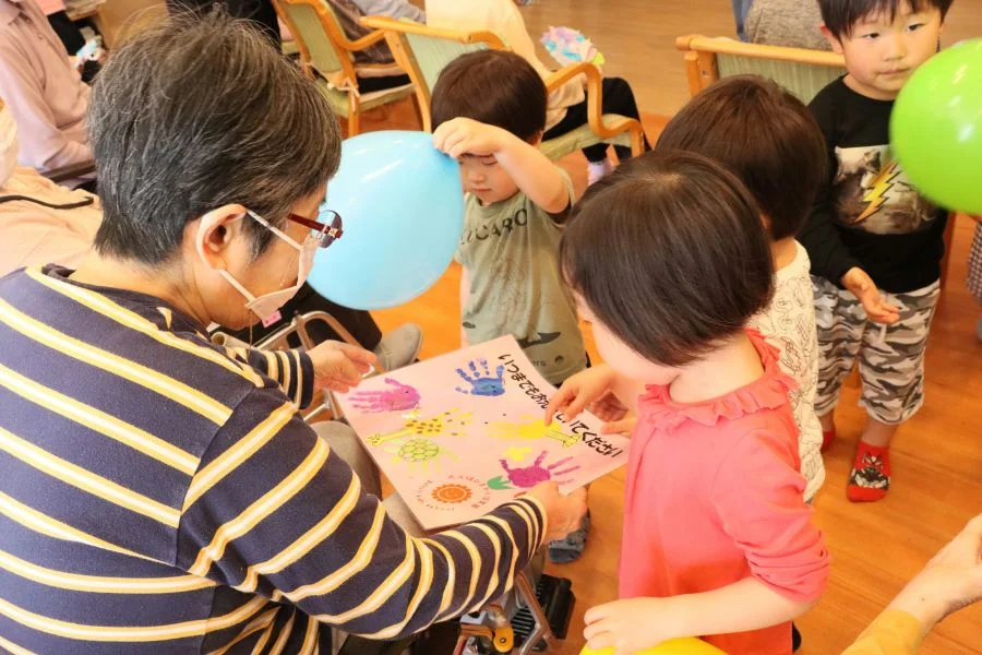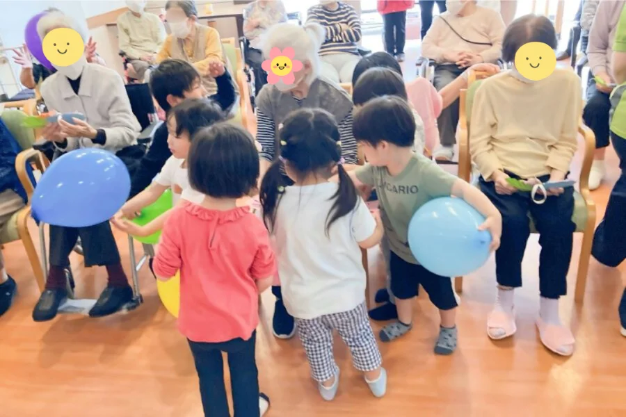 みんなで風船運びゲームに挑戦!風船を落とさないようにそっと運ぶ姿に、周りからは声援が送られました。「がんばって!」「もう少し!」と声をかけ合いながら、みんなで協力して風船を運びました。風船が落ちそうになると「わあっ」と一緒に慌てたり、上手にゴールできたときには嬉しそうにハイタッチしたりと、にぎやかな雰囲気に。世代をこえて心が通い合う、あたたかな時間となりました。