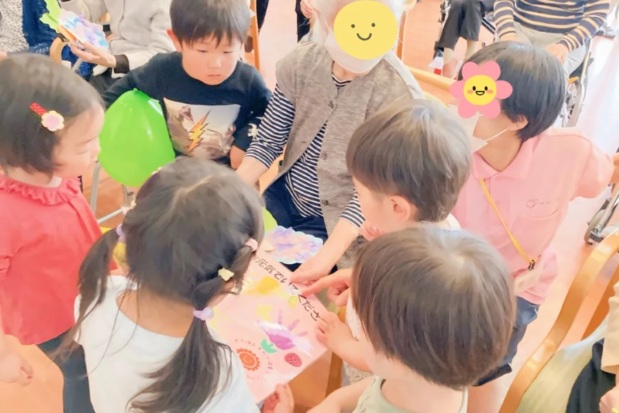 最後に、子どもたちが心を込めて作った作品をプレゼントしました。カラフルな折り紙や絵が添えられたその贈り物を手渡すと、おばあちゃんたちは「ありがとうね」と、大切そうに手に取って喜んでくれました。