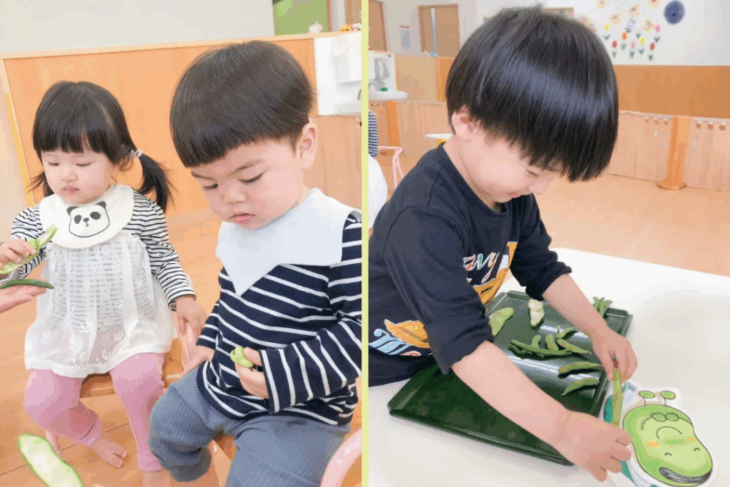 製作にあたっては、そらまめのイメージが膨らむように、製作前に「そらまめくんのベッド」の絵本を読み聞かせたり、実際にそらまめを触ってもらったりして、興味を引き出しました。お子さまたちからは「ベッドがふわふわにできた!」「絵本と同じように作れた!」といった嬉しい声も聞かれ、楽しみながら取り組む様子が見られました。