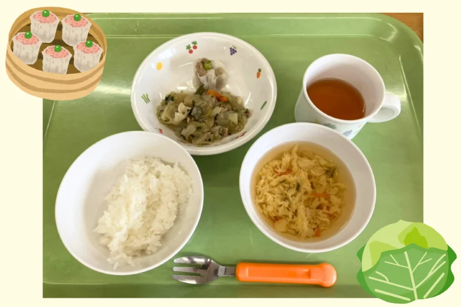 栄養バランスを考えて、キャベツをたっぷり使った焼き肉が登場。シャキシャキとしたキャベツの食感が楽しい一品です。さらに、やさしい味わいのかきたま汁が、ほっとするひとときを添えてくれます。栄養も満点、子どもたちの元気を支えるパワフルな献立となりました♪