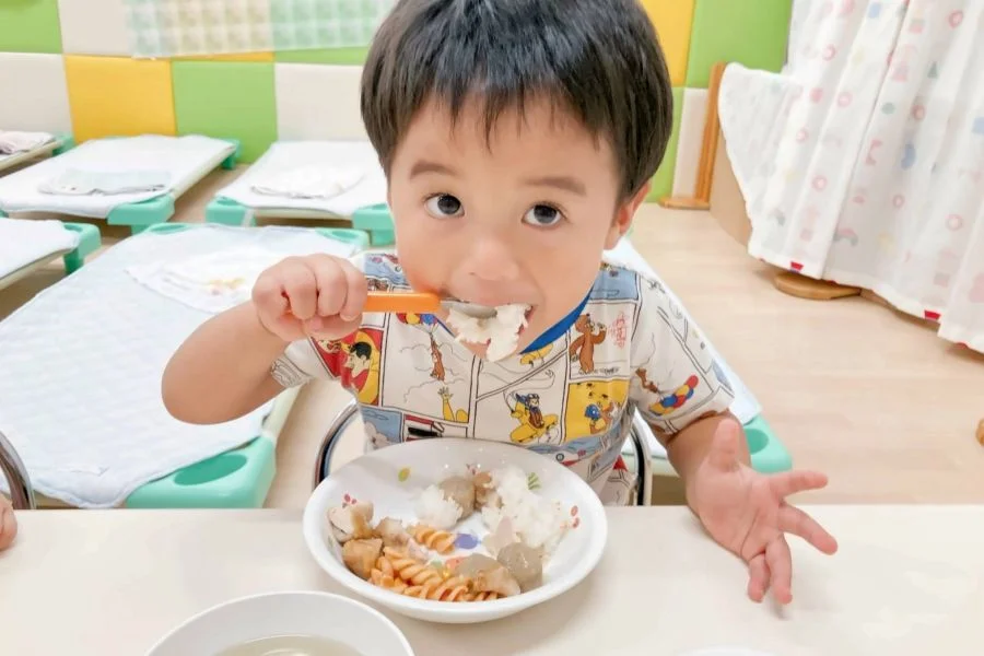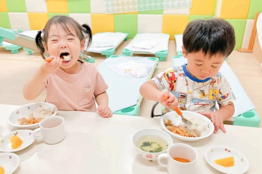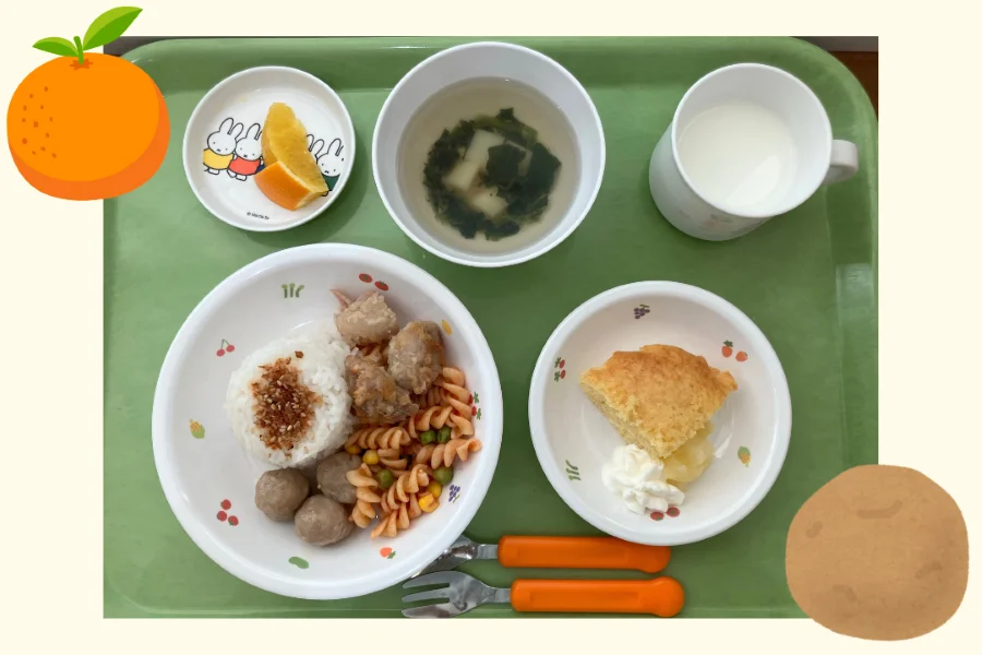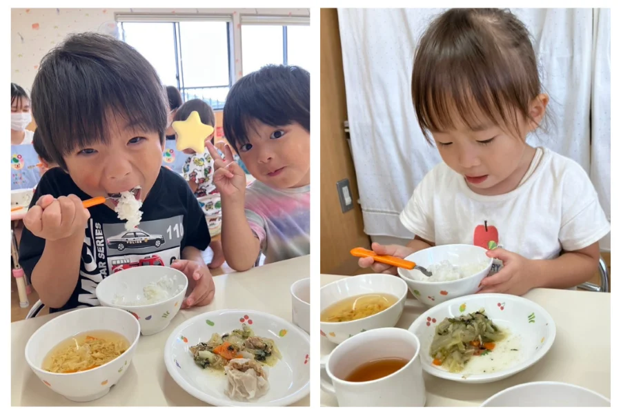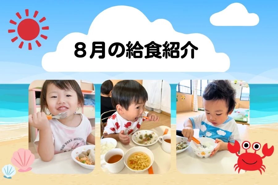 そして、キッズスクールでは園児たちが健やかに過ごせるよう、毎日栄養バランスのとれた給食を提供しています。今回は、8月の給食を紹介いたします。