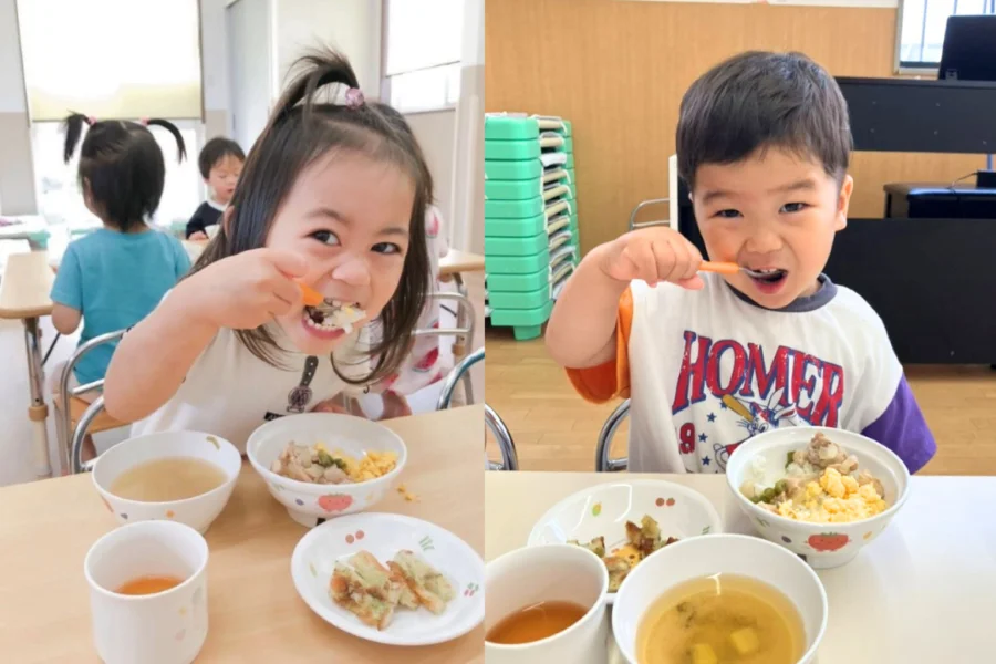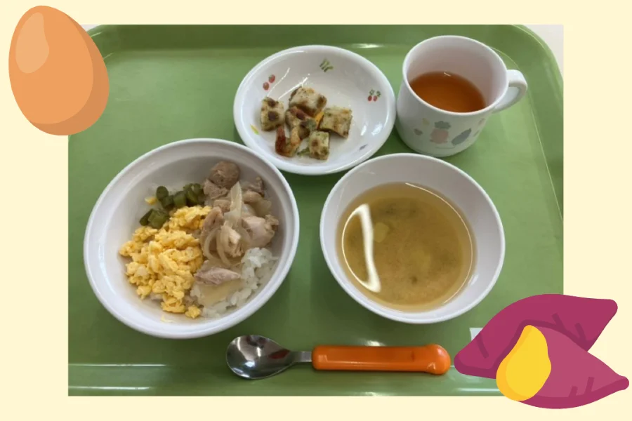 鶏肉・卵・インゲン豆を使用した、見た目も楽しい三色丼が登場しました。また、さつま芋のみそ汁は、食物繊維が豊富で食べ応え満点です。みんな大きく口を開けて、おいしそうに頬張っていました♪