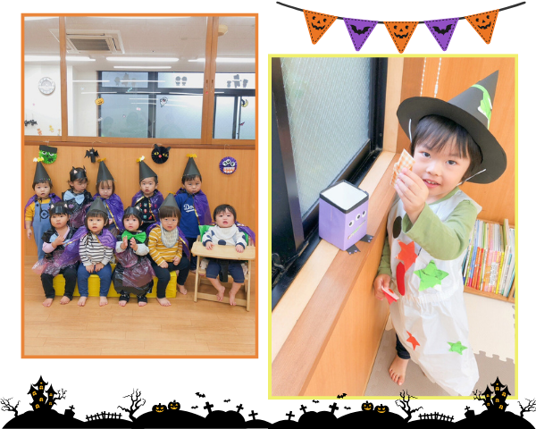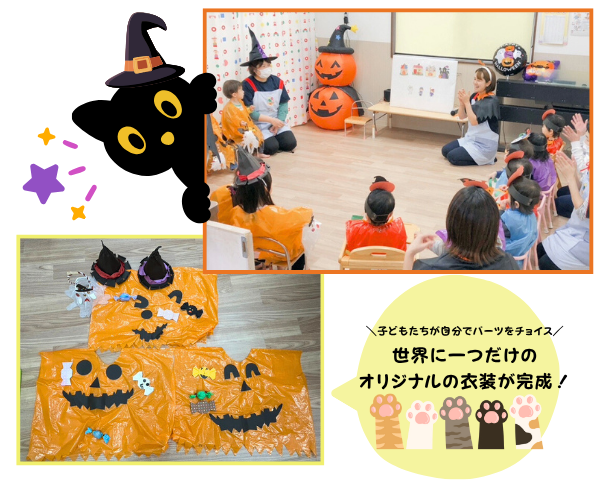 魔女のお家にお菓子をもらいに行ったり、かぼちゃのおばけが登場したりと、ハロウィンならではのイベントを楽しみました。子どもたちが着ているかぼちゃの衣装は、子どもたち自身が顔のパーツやキャンディを選んで貼り付けた、一人ひとり異なるオリジナルデザインです。当日は自分で作った衣装を身に着けて嬉しそうに過ごし、魔女からお菓子をもらうと、「お菓子もらったよ」と笑顔で話す姿が見られました。