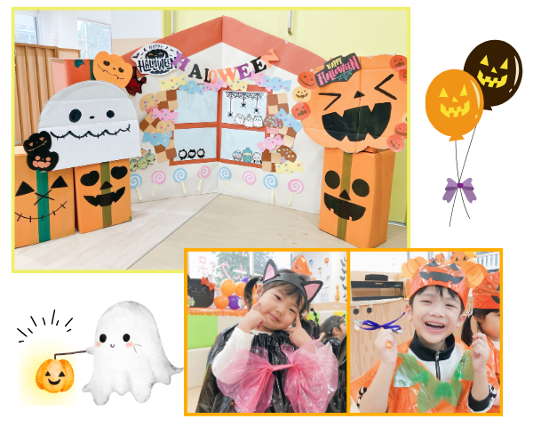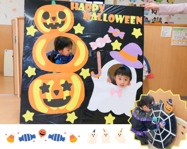 ハロウィンの由来を学んだり、みんなでダンスを踊ったりしました。保護者の方が記念写真を撮れるフォトブースも設け、園内は華やかな雰囲気に。パンプキン型にラッピングされたお菓子をいろんな部屋に隠し、探検気分で見つける「お菓子探し」は子どもたちに大人気。見つけたお菓子を友だちに分けてあげる優しい姿も見られ、心温まるハロウィンとなりました。