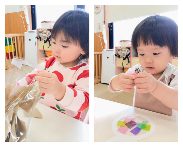 「フクロウと雪だるま」の製作では、フクロウは紙をクルクルと丸めて袋に詰め、最後に目や鼻を貼って作成しました。雪だるまは、おなかの部分にテープを貼り、その上に子どもたちがカラーセロハンを付け、目や鼻をシールで貼り付けて作成しました。子どもたちは、カラーセロハンを貼るときに「ぺったんぺったん」と声に出しながら製作したり、完成した雪だるまを見て「雪だるまさんかわいい」などと言いながら喜ぶ姿が見られました。