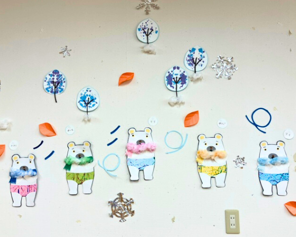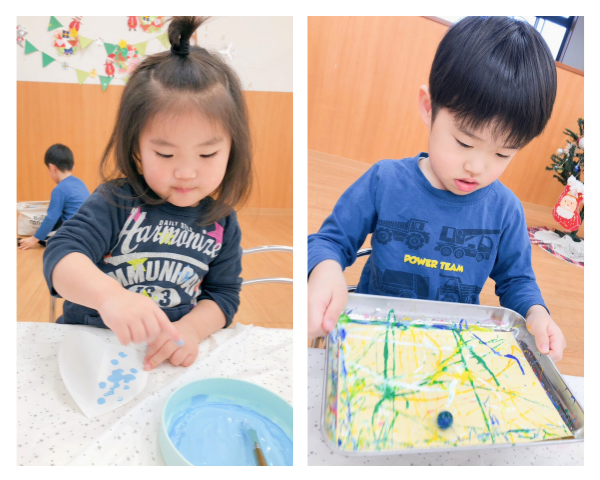子どもたちが大好きな絵本「しろくまのパンツ」にちなんだ製作を行いました。冬らしさを表現するため、パンツに加えてマフラーも製作しました。パンツの模様は、トレイに敷いた画用紙の上で、絵の具をつけたビー玉を転がす「転がし技法」で製作し、ビー玉が転がることで偶然できる模様を楽しみました。また、紙に絵の具を塗って二つ折りにし、転写させて楽しむ「デカルコマニー技法」で冬の木を表現しました。子どもたちは、ビー玉を転がす動きが楽しかったようで、何度も繰り返し行う姿が見られました。
