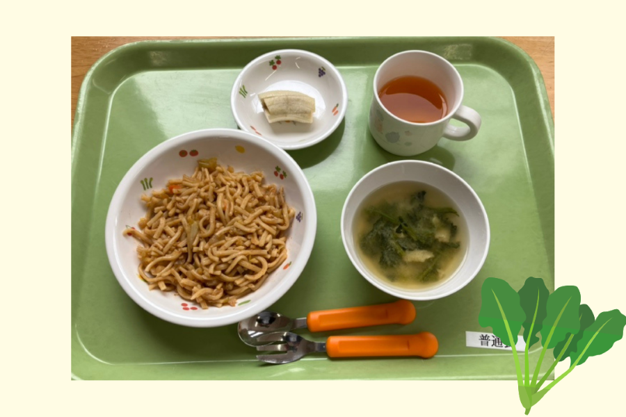ソースのいい香りが広がる焼そばと、栄養たっぷりのほうれん草のみそ汁が登場。「おいしい!」と子どもたちの笑顔がたくさん見られました♪