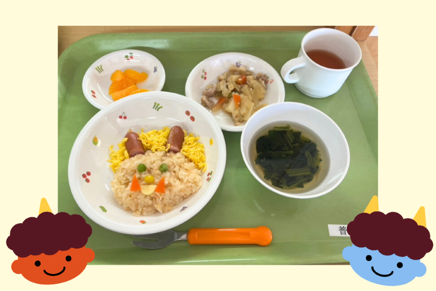 節分にあわせて、鬼ごはんが登場。子どもたちは「鬼だ!」「かわいい!」と嬉しそうに食べており、伝統行事に親しむ献立でした♪
